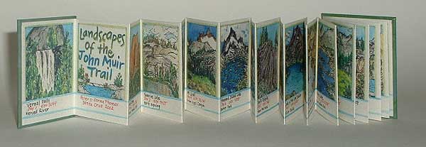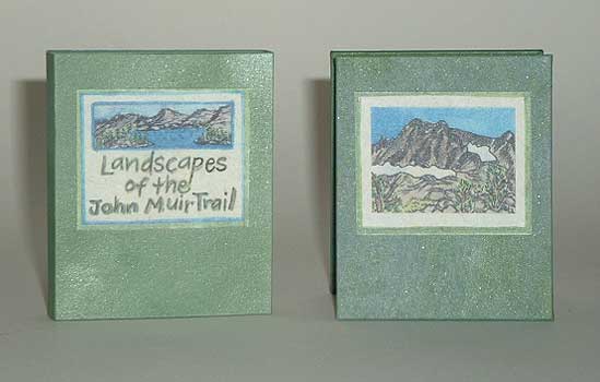 Landscapes of the John Muir Trail (2002). Donna Thomas. In 2002 Donna once again hiked the 218 mile John Muir Trail. She hiked 29 days and painted a landscape picture a day. Her paintings have been reproduced as beautiful color copies on Peters handmade paper (made from cotton rag and the shirt Donna wore on the trail). 24 accordion pages, 2 5/8 by 2 1/8 inches, bound in painted handmade paper with a paper slipcase. 150 copies. $75