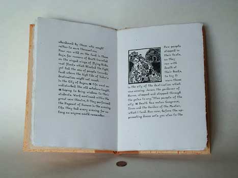This is a fairy tale written written and printed with Peter and Donna worked the the Renaissance Pleasure Faire. Peter made the paper and Donna cut the illustrtions in linoleum. The type is handset using 18 point Anglo, a modern reproduction casting of a vintage advertising type. The type was chosen for its chaotic design which complements the text, as well as for for the cross inside of the lower case "o", which was remeniscent of a Goudy type used by the Grabhorns in many of their books we so admired at the time.