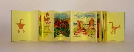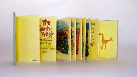 The Southwest (2010). Donna Thomas. 2 1/4 by 1 3/4 inches. This book is a series of watercolor paintings of landscapes that Donna painted in National Parks we passed through in the Southwest during our wandering book artist's gypsy wagon trip in April and May of 2010. The watercolor illustrations have been color copied on Peter's handmade paper. Pictographs, patterned after Navajo rock paintings, have been stenciled on the first and last pages using pigments gathered from the base of ? rock in Sedona, AZ. The panels used to bind the book are covered with Peter's paper made from cotton rag mixed with Yucca fiber gathered in the high desert near the Calfornia Arizona border. 16 accordion pages. 50 copies $55.