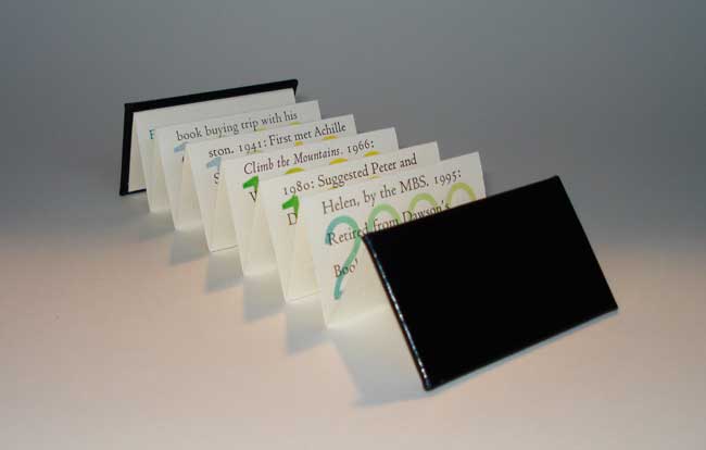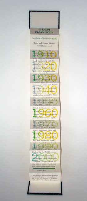 Glen Dawson (2008). A timeline biography of a respected bookseller. 1 5/8 by 2 15/16 inches. 14 accordion pages. 65 copies. $50.