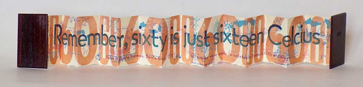 This book was made by Peter to celebrate Donna's 60th birthday. The text was letterpress printed on Peter's handmade paper. The first press runs were made with found printers cuts of cows grazing in fields. The image was first printed on the tympan - so it would offset and print as a ghost image the back side of the paper. The ghosted images were intended to make a nonspecific statement about how the past can either haunt us or provide a fertile field for pleasant memories. The block was then reversed and printed in a second color the same way. Finally all sheets were curated - if the ghost image was too light the sheet was reprinted (with little ink and little pressure) to mimic the ghost prints. The next layer of printing was the numbers: 60606060 printed across the full length of the accordion page. Different sizes of wood type numbers were used for each side of the page. Next the quotes were printed, one quote per side. The Browning quote was printed with transparent black ink - so the printing underneath would ghost through. This was intended reinforce the nonspecific statement about the past. Then the anonymous statement about Celsius versus Fahrenheit was printed on the other side. Finally the title and colophon information were added under that line of text. In all there were about a million press runs made to print this book. The binding is made using sustainably harvested rosewood, off-cuts from guitars made at the Santa Cruz Guitar Company. The SCGC chooses each piece of wood specifically for its quality as a tone wood, so when you beat on our book with a mallet it will sound better than most other books would sound. The title is hot stamped into the front cover. Each time a cover is stamped the type is smashed and new type is required, a final act reinforcing the nonspecific statement about the results of the passing of time.