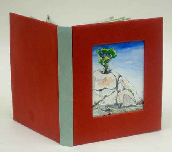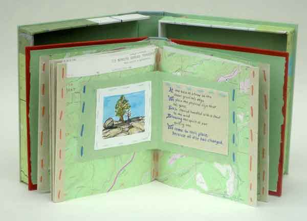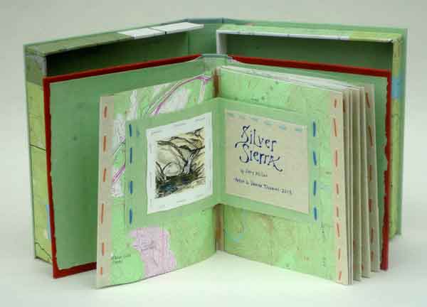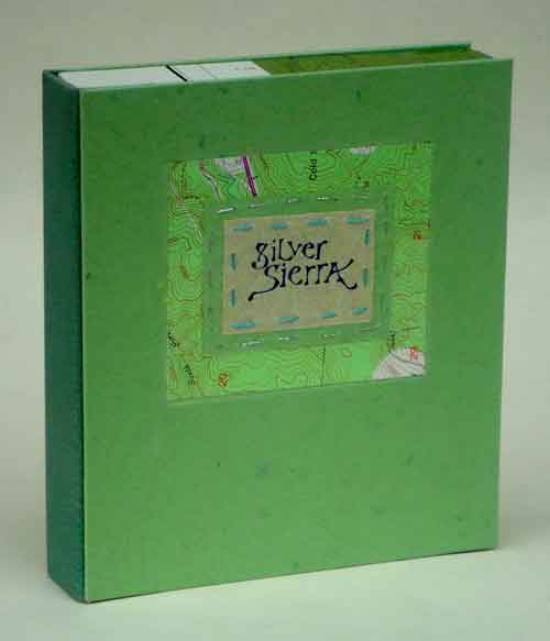 This is a one-of-a-kind book was calligraphed, illustrated and bound by Donna Thomas using Peter's handmade paper. The text is a poem acknowledging familial closeness within a relation to nature that was written by Donna's brother in honor of her father (whose ashes were spread in the "Silver Sierra." The text and illustrations are glued to paper panels that have been hand stitched to an accordion folded topographic map of that area of the Sierra. This map was one Donna and Gary used when backpacking with their father. The book is full bound in leather with an illustration inset into the front cover. The book is housed in a clamshell box that has the title on a topographic map panel on the front cover.
