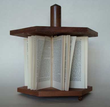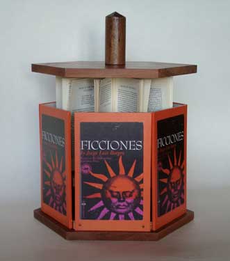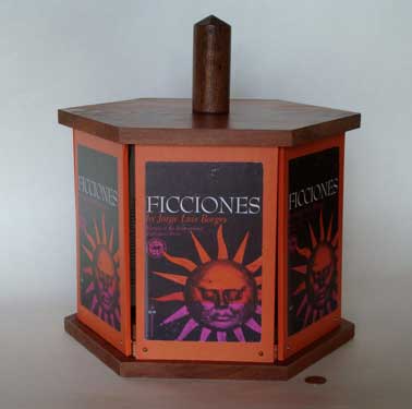 We have used this concept as inspiration for this hexagonal binding of Ficciones, a paperback edition of the original Groves Press 1962 edition. The binding was made for the 2006 Helen De Golyer Bookbinding Triennial (HDGBT). The pages were removed from the original binding then gathered as sections and sewn over wooden dowels. These dowels hold the pages in the book in a way that is similar to the way newspapers used to be held in library racks. A threaded hollow steel rod (ventiilation shaft) connects two redwood hexagons that function as lids or covers for the "universe". This book structure is housed in a hexagonal slipcase that has six panels, each made from a copy of the original books' cover, that are attached to a redwood base. The book slides into the slipcase from the top.